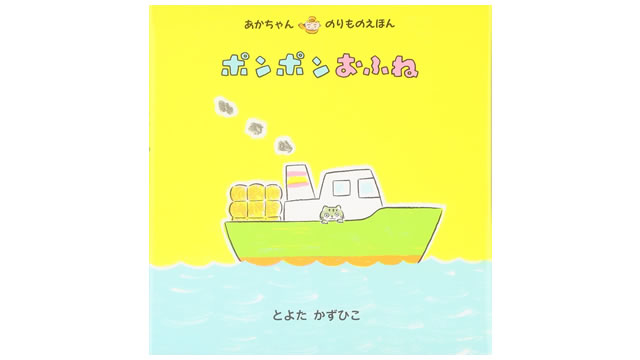 とよたかずひこさんの『ポンポンおふね』(2008年 アリス館)は、「あかちゃんのりものえほん」シリーズ第4弾。表紙からも元気いっぱいの雰囲気が伝わるこの絵本は、ちいさな船に乗ったねこが主人公。「ポンポンポンポン」とエンジン音を響かせながら水の上を進みます。途中で大きな客船が横を通ったりして、ねこの小さな船旅はちょっとドキドキ。果たして無事におうちに帰れるのでしょうか? 短い言葉とリズミカルな擬音で進む物語は、赤ちゃんから楽しめるわかりやすさとユーモアにあふれています。