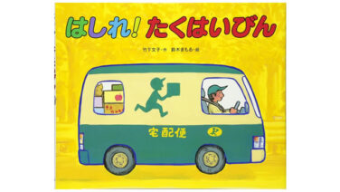 『はしれ!たくはいびん』は畑のりんごを宅配便で町へ運ぶお話。小さなトラックから大きなトラックへと荷物がリレーされる姿を描く乗り物絵本。